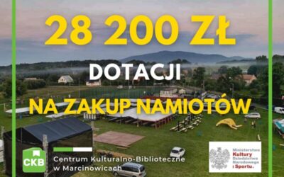 Wniosek Centrum Kulturalno-Bibliotecznego w Marcinowicach złożony w Ministerstwie Kultury, Dziedzictwa Narodowego i Sportu uzyskał wsparcie w wysokości 28 tysięcy 200 złotych. W ramach programu “Infrastruktura domów kultury 2021” zakupionych zostanie kilkanaście profesjonalnych namiotów do organizowanych przez Centrum Kultury i Gminę Marcinowice wydarzeń.